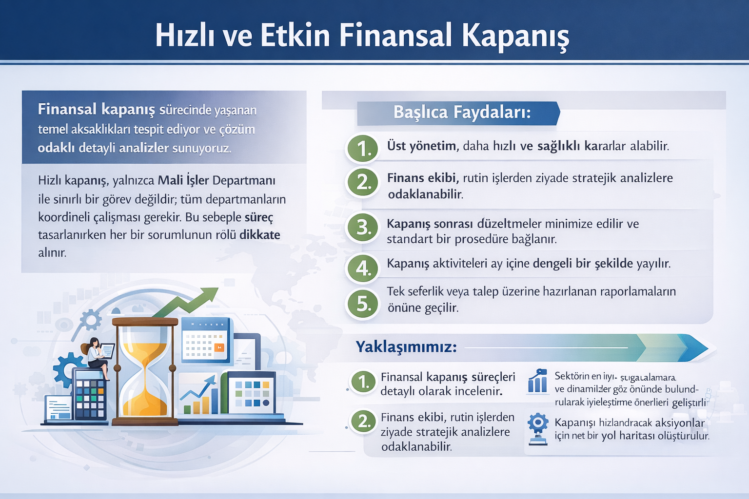 Finansal kapanış sürecinde yaşanan temel aksaklıkları tespit ediyor ve çözüm odaklı detaylı analizler sunuyoruz. Hızlı kapanış, yalnızca Mali İşler Departmanı ile sınırlı bir görev değildir; tüm departmanların koordineli çalışması gerekir. Bu nedenle süreç tasarlanırken, her bir sorumlunun rolü dikkate alınır.